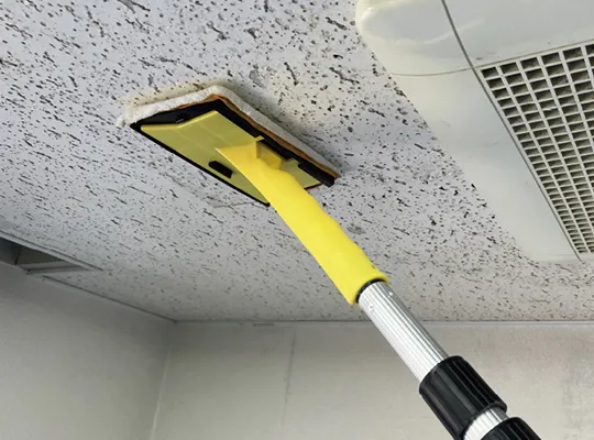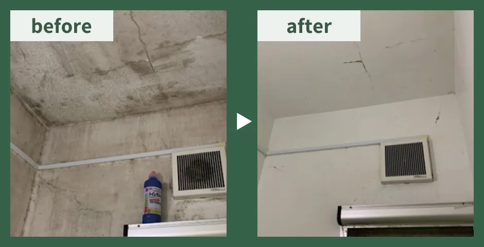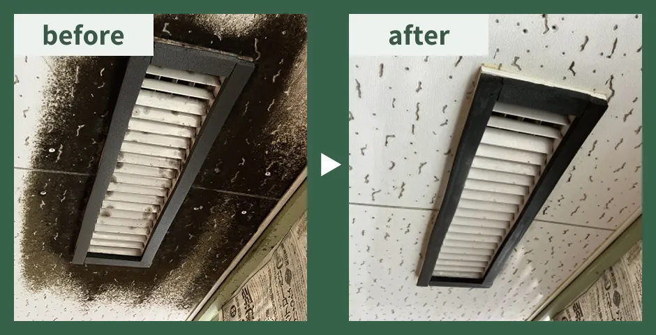 除去します!専用の薬剤を使い、カビの根まで除去します。天井の張り替えやクロス交換と比べて、短時間・低コストでの対応が可能です。
